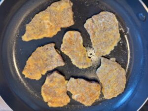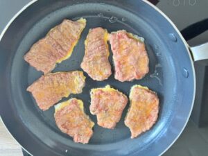 - Dip each floured beef slice into the egg mixture and place it in the pan.