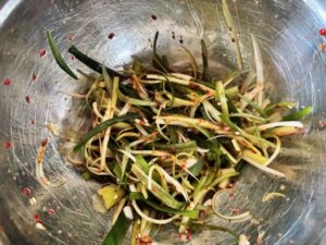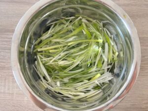 - Soak the strips in cold water for about 5 minutes to remove strong pungency,