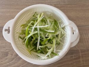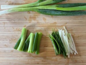 - Cut the green onion lengthwise (5-6cm) and slice into thin strips. (Be careful! eyes might be burning from the green onion )