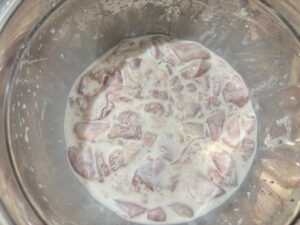 - After marinating, drain the milk. Don't wash chicken.