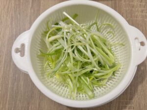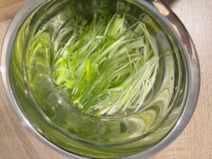 After soaking, toss the green onions lightly with a pinch of salt + a few drops of sesame oil.