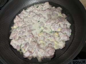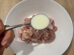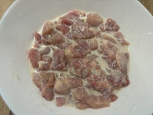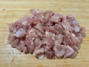 - Cut chicken into bite-size pieces.(1cm dice size)