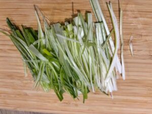 - Cut green onions into thin, long strips.