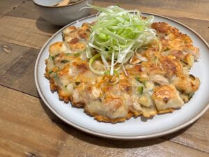 In Korea, “jeon” simply means a savoury pancake, and there are so many kinds! The classic pajeon (green onion pancake) is a rainy-day favourite, but this version takes things up a notch by adding marinated chicken. The result is a dish that’s more filling and protein-packed, making it perfect for sharing at dinner or enjoying with a glass of chilled makgeolli (Korean rice wine) or beer.