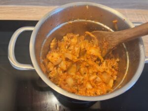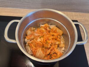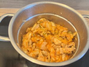 - Add the aged kimchi and stir-fry together for 3–5 minutes.