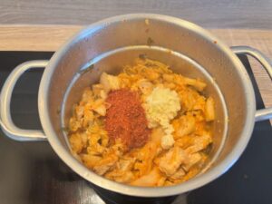 - Add 1 tbsp of gochugaru and 1 tbsp of minced garlic.