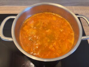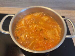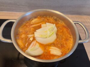 - Pour in 2–2.5 cups of water and 1/2 cup of kimchi juice. Bring to a boil.
