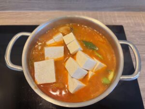 The stew begins with stir-frying aged kimchi—sour, spicy, and full of character—until it softens and releases its fragrance. Pork belly sizzles alongside it, adding richness and depth. Water and kimchi juice are added, and the pot simmers gently, sending small bubbling pops to the surface. The stew becomes thicker, redder, more soulful as the ingredients meld together.