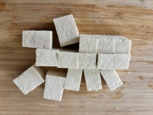 Cut the tofu into thick rectangular slices or cubes.Add toward the end so it doesn’t break apart.