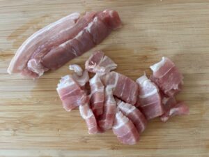 - Pork (Samgyeopsal or other cuts)Cut the pork into bite-sized pieces (about 2–3 cm).