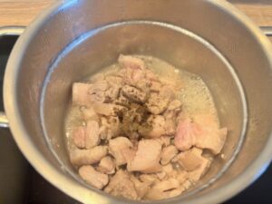- Heat 1 tbsp of cooking oil in a pot and stir-fry the pork until most of the pink is gone. If using pork belly, you don’t need extra oil when stir-frying since the fat will render out naturally.