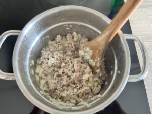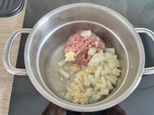 1. Heat a little vegetable oil + sesame oil in a pot. Add ground pork, chopped onion, and minced garlic.