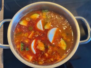 The soft tofu went in last, breaking apart into delicate clouds that floated in the red broth. Sometimes I add mushrooms for extra depth or a handful of zucchini for a sweet, summery note. Every variation feels like a new chapter of the same comforting story. When the stew began to simmer, the kitchen felt warmer and cosier, as if the dish itself carried a small piece of home within it.