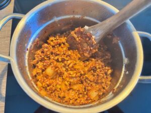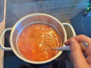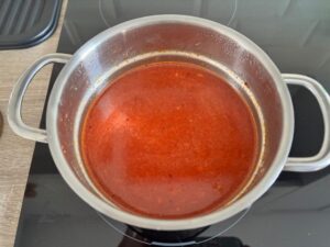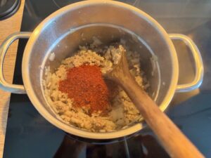 As the pork sizzled in the pot with a spoonful of garlic, the aroma began to fill the kitchen, rich, savoury, and slightly sweet from the onions. I sprinkled in a scoop of gochugaru, and instantly the oil turned a vibrant red, bubbling with the unmistakable warmth of Korean chilli flakes. That moment, when the chili hits the oil, is when the stew gains its soul.